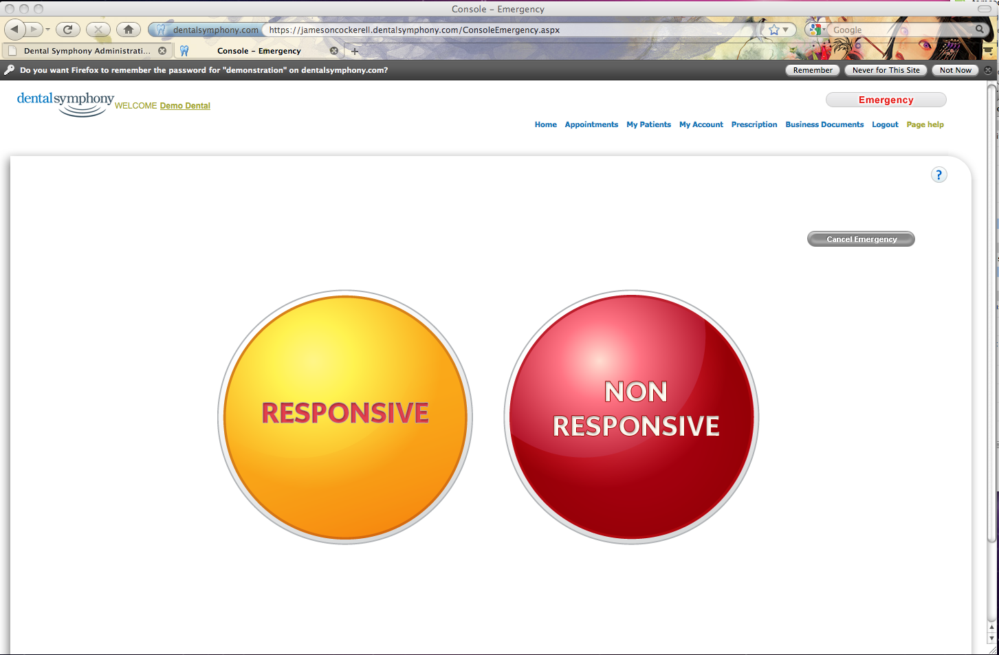 As soon as one pressed one of these buttons a pathway is taken to manage the patient. And importantly as one moves from this point all computers in the dental office will have a notice popup informing of the emergency and providing prescribed job of each staff person.