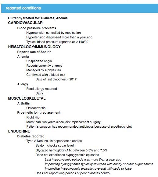 Our system defaults to ‘no’ or ‘within normal limits’, so you see first the need-to-know information like alerts in red at the top followed by anything reported by the patient based on each medical system.