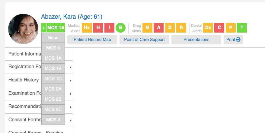 This system, to quickly evaluate your medically complex patients (the MCS system), allows for an at-a-glance patient assessment for key risk factors like alerts, dental clinical concerns related to medications, as well as the patient’s caries risk and frequency of tobacco use.